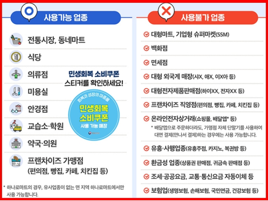 이 쿠폰은 소상공인과 자영업자의 매출 증대를 최우선 목표로 하기에, 사용처 제한은 중요한 정책적 조치랍니다.