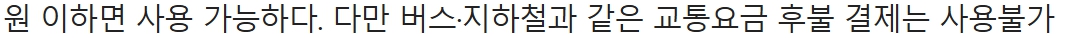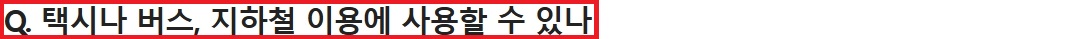 | 버스/지하철 | 적용 지침에 따라 불가 | – | ❌ 모든 선불·후불 교통카드는 사용 불가 |