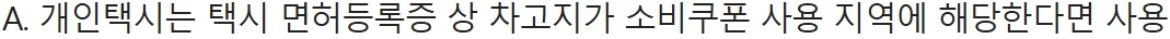 - 개인택시: 차량 차고지가 쿠폰 사용 지역 내이면 가능 (O)