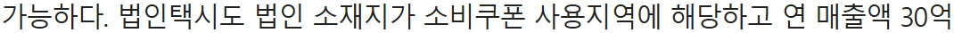 - 법인택시: 법인이 쿠폰 지역에 등록되고 해당 차량의 연 매출이 30억 원 이하라면 사용 가능 (O)