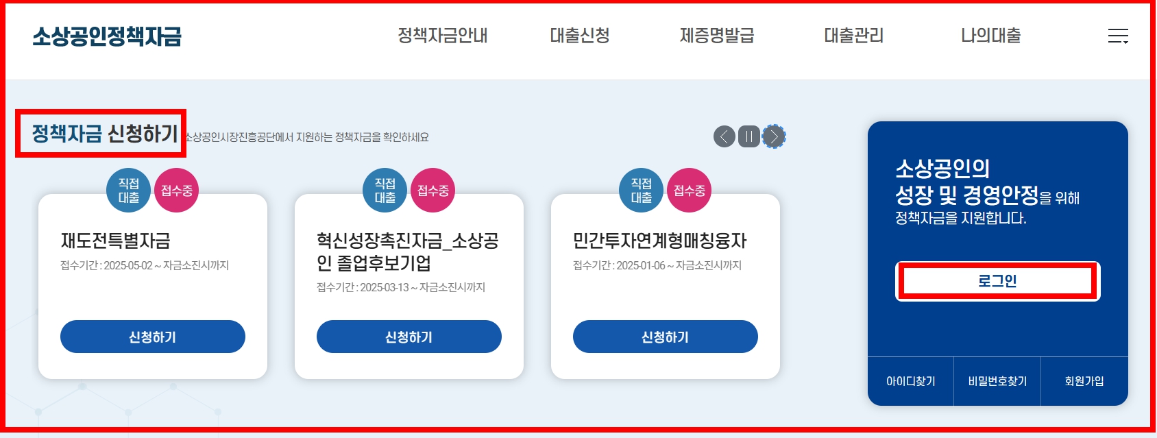 - 상단 메뉴 ‘정책자금 → 직접대출 또는 대리대출’ 클릭