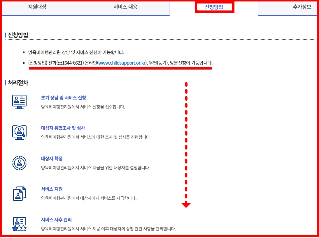 - 온라인: 양육비이행관리원 웹사이트(www.childsupport.or.kr) 접속 후 신청