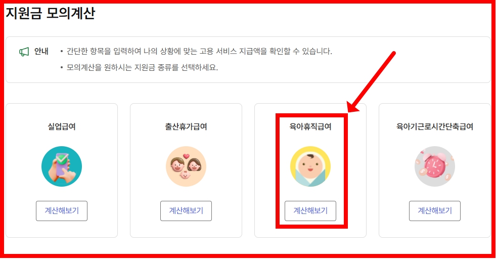 → 육아휴직급여 모의계산 기능 제공 - 일반 육아휴직급여 계산기 (work.calculate.co.kr)