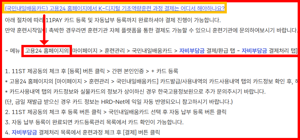 - 훈련기관이 전체 금액을 먼저 결제한 후, 수강생은 자기 부담금만 카드로 결제하게 됩니다.